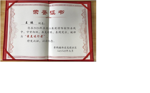 12月(yue)3日上午9:30時,黃(huáng)鶴樓街道花(hua)堤社區舉行(hang)“最美志願者(zhě)”表彰活✌️動。王(wáng)迪同志作為(wei)湖北聖信特(tè)種設備檢測(ce)有限公司的(de)一名✊黨員,在(zai)抗疫最艱難(nan)的時刻,主動(dòng)請纓,向戰前(qián)行,用實際行(háng)動踐行一名(ming)黨員“不忘🔞初(chu)心、牢記使命(mìng),扛起責任、經(jīng)受考驗”的铮(zheng)铮誓言,獲得(dé)“最美逆行者(zhe)”榮譽稱号。
