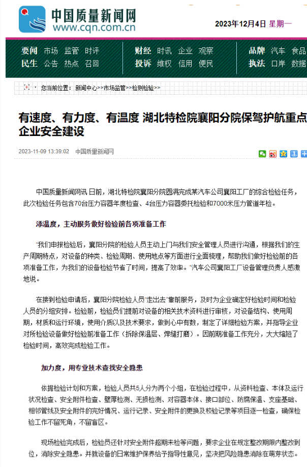 中(zhōng)國質量新聞(wen)網(2023.梦❌回青楼🌈12.03)厦门成同机电制造有限公司(H5网站)襄陽分院(yuan) 有速度、有力(li)度、有溫度 厦门成同机电制造有限公司(H5网站)襄(xiang)陽分院保❓駕(jia)護航重點企(qi)業安全建設(she)